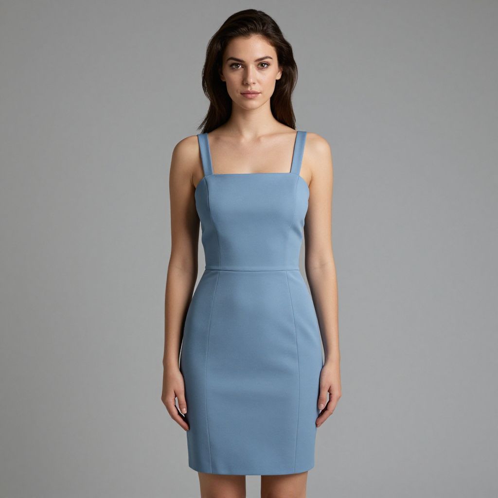"Woman, minimalist chic, solid periwinkle blue sheath dress, thin spaghetti straps, square neckline, sleeveless, structured bodice, seam at waistline, short hem length, straight cut, gray studio background. Sexy. Pretty face and beаutiful eyes. Big breasts."