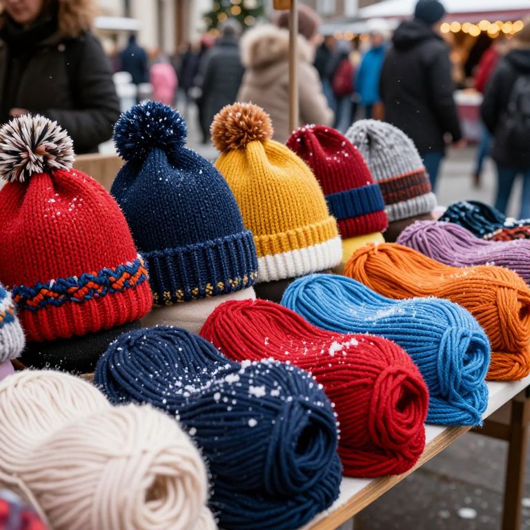 Photograph of a market stall displaying a variety of knitted winter hats and yarns. The hats, in vibrant colors like red, navy blue, yellow, and white, feature pom-poms and patterned brims. The yarns, in colors like blue, orange, and red, are neatly coiled on the wooden table. In the blurred background, people in winter clothing walk by, with festive string lights visible. The scene is lively and colorful, capturing the essence of a bustling outdoor holiday market.