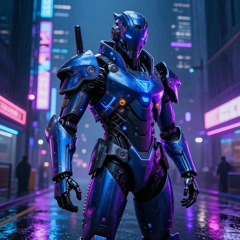CGI image of a futuristic, blue and purple armored robot with glowing neon accents standing in a rainy, neon-lit urban street at night.