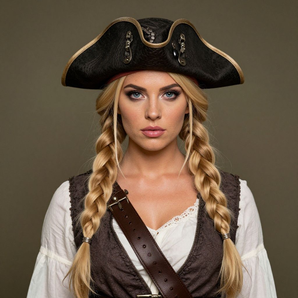 Pirate costume elizabeth, 1girl, solo, hat, braid, blonde hair, long hair, twin braids, blue eyes, belt, looking at viewer, upper body, realistic, pirate hat, pirate, lips