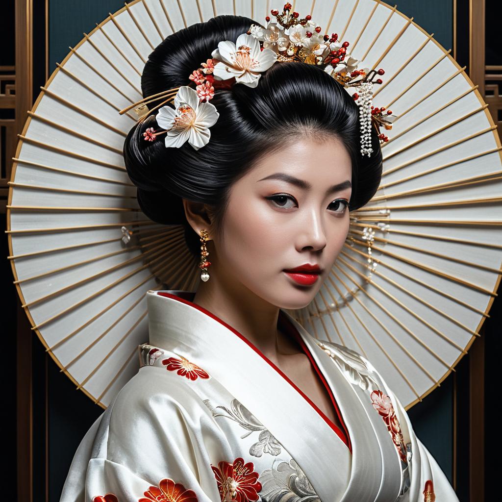 Portrait of a serene Japanese geisha wearing a white silk kimono with floral patterns and a colorful obi. She has smooth glowing skin, a contemplative expression, and traditional kanzashi hair ornaments with flowers and red berries. The background features a large traditional Japanese paper umbrella, enhancing the cultural aesthetic.