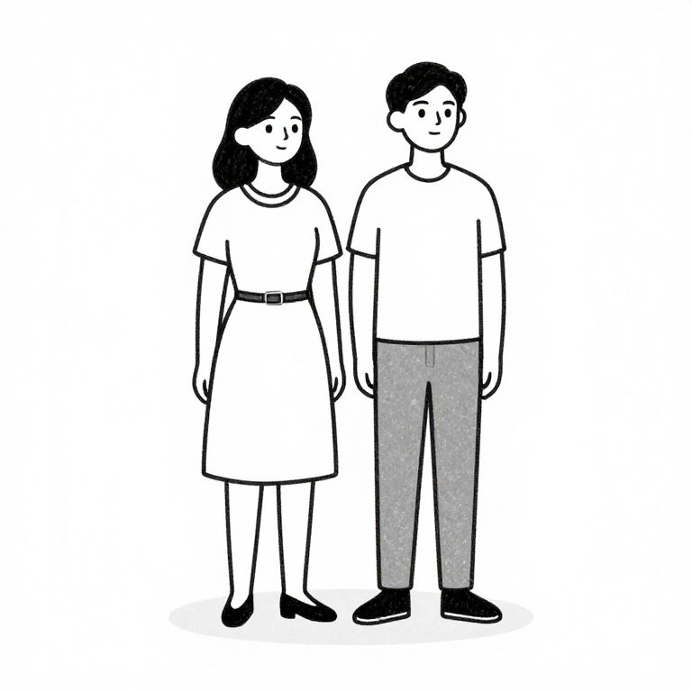 This is a black-and-white digital drawing of a simple, minimalist style. It depicts a woman and a man standing side by side. The woman has straight, shoulder-length black hair, wears a short-sleeved, knee-length dress with a belt, and black shoes. The man has short black hair, wears a plain short-sleeved t-shirt and gray pants, and black shoes. Both figures have simplistic, round facial features with small, smiling mouths and no detailed expressions. The background is entirely white, making the figures the sole focus. The drawing uses bold, clean lines and minimal shading.