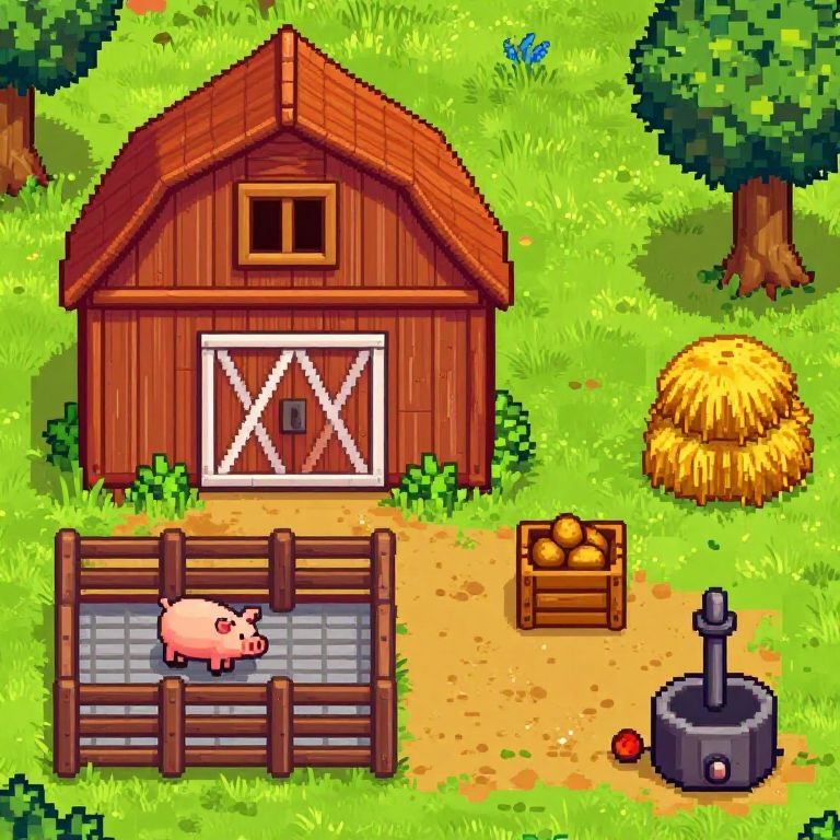 A vibrant pixel art depiction of a quaint farm scene featuring a wooden barn, a fenced pig pen, a stone fruit basket, a wooden crate of potatoes, a stack of hay bales, and a rustic water well, all rendered in a charming, retro-inspired style reminiscent of games like Stardew Valley.