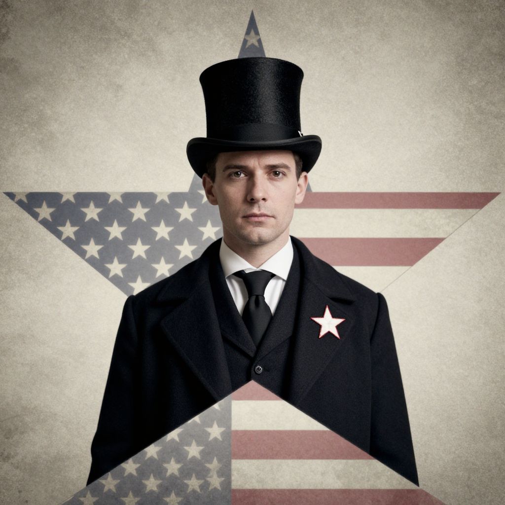 The image features a man dressed in a vintage outfit, reminiscent of the 19th century, with a black top hat adorned with a white star. He is wearing a dark coat with a white star on the lapel, and a white shirt with a black tie. The background is a star-shaped design with a faded American flag pattern, creating a striking contrast with the man's dark attire. The overall composition is balanced, with the man centrally positioned and the star design framing him, emphasizing his presence. The textures of the man's clothing and the star's pattern add depth to the image, while the monochromatic color scheme with the exception of the red star on the coat's lapel creates a dramatic and visually engaging scene.