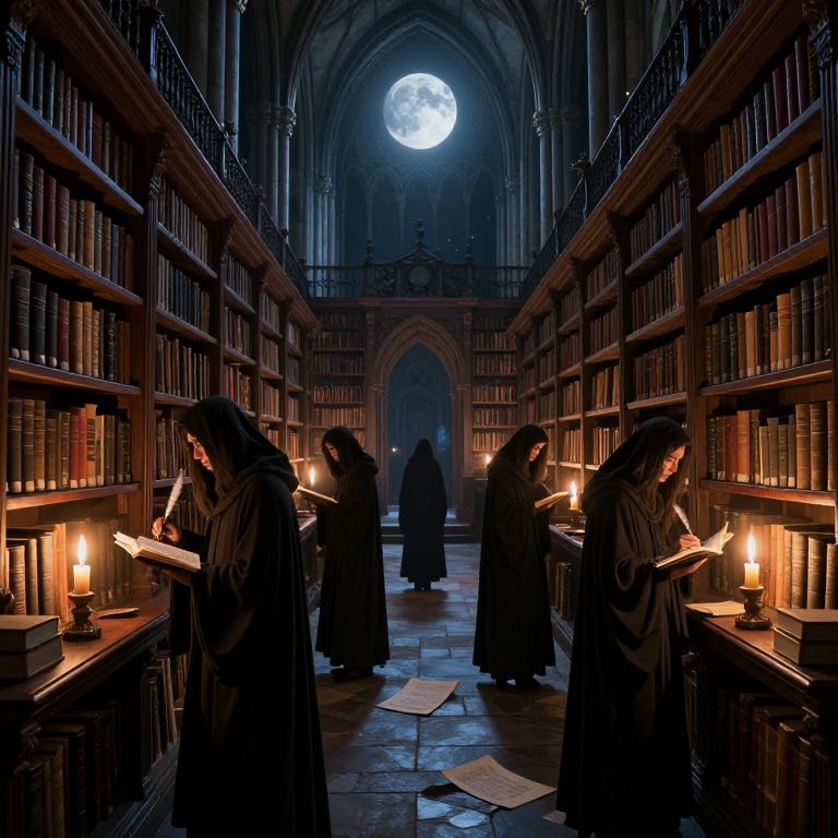 In a grand, moonlit cathedral library rendered in high-definition digital art, cloaked figures navigate stone corridors lined with towering bookshelves, their quills poised over scattered manuscripts illuminated by flickering candlelight, evoking a mystical atmosphere where dreams and memories intertwine.