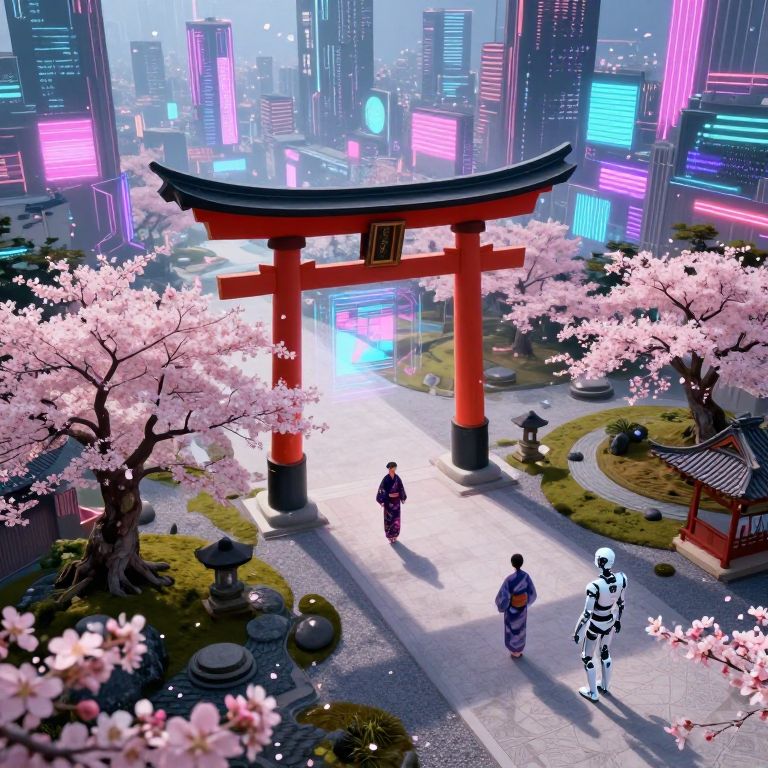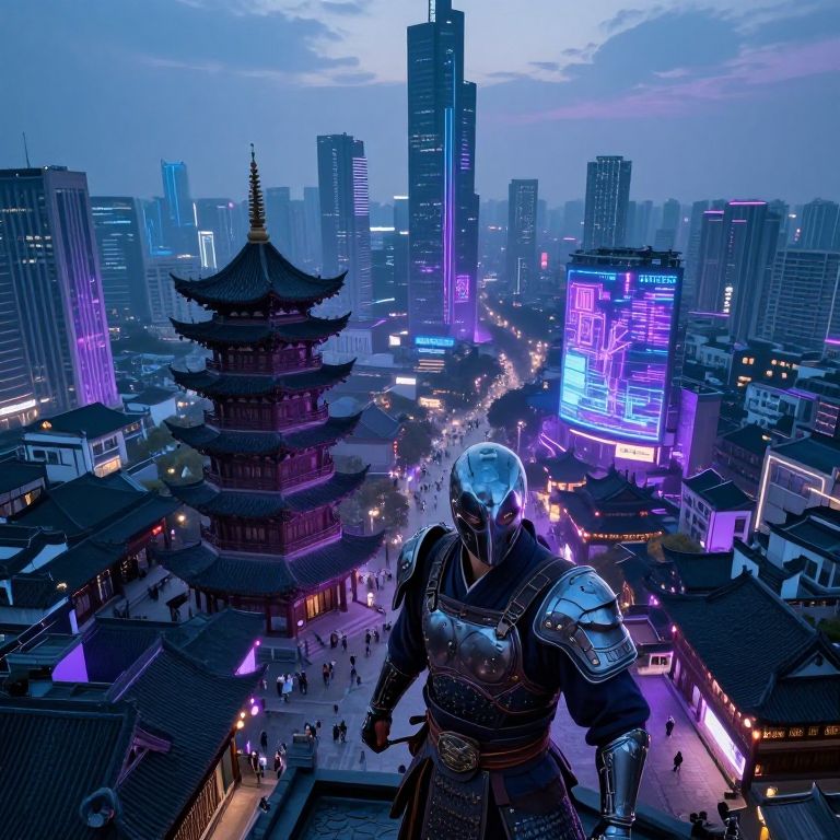 A surreal digital artwork depicting a futuristic cityscape intertwining with an idyllic Zen garden from an aerial viewpoint. Intricate clock-like structures are seamlessly integrated into the verdant bamboo groves and cherry blossom trees, creating a dreamlike fusion of technology and nature. At the nexus of this enigmatic landscape stands a solitary figure clad in high-tech armor reminiscent of a samurai suit, their face concealed by a mask reflecting the warm hues of the setting sun. This captivating scene exudes an aura of mystique and wonder, harmoniously blending advanced technology with serene natural beauty to evoke a profound sense of awe.