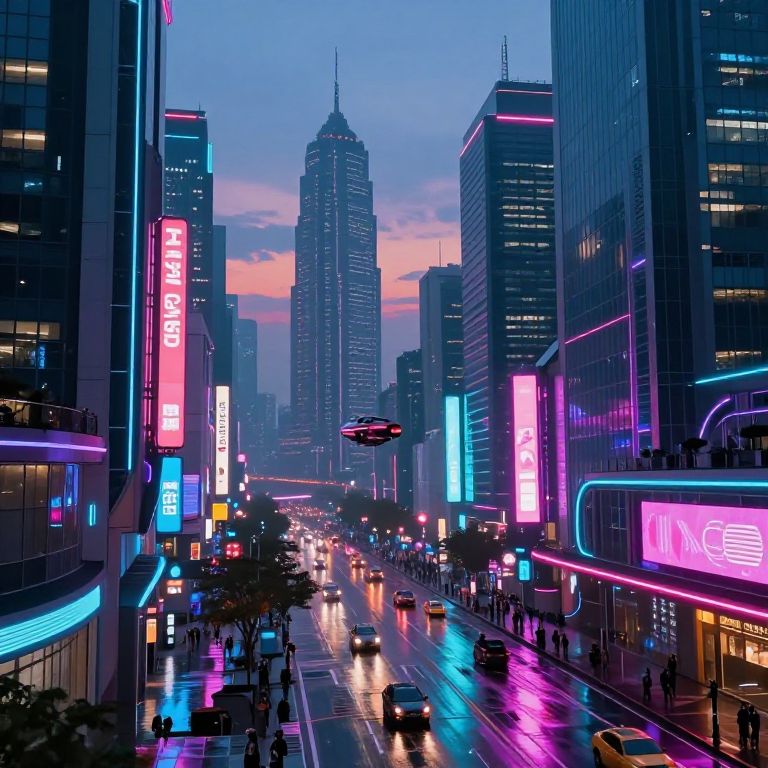 Neon-lit, futuristic cityscape at dusk. Tall skyscrapers with vibrant pink, blue, and purple signs line the wet, reflective street