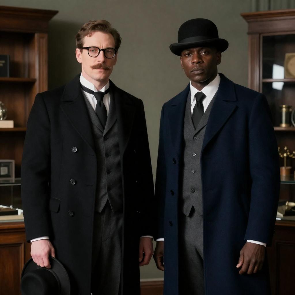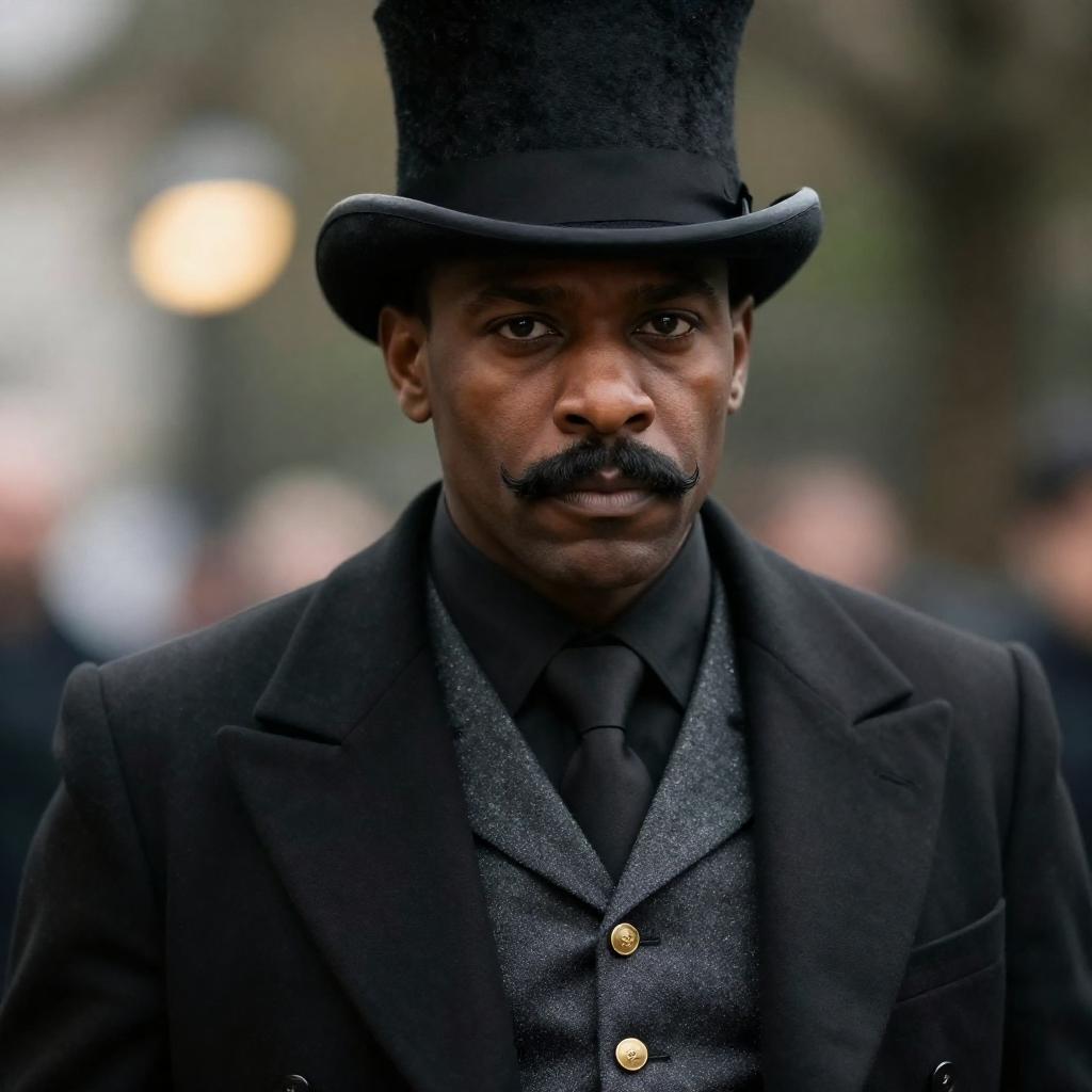 Photograph of a man with a dark complexion, thick mustache, and intense expression. He wears a black top hat, black coat, and a glittering gray vest with gold buttons. The background is blurred with bright, warm lights and dark foliage. His stern gaze is directed forward.