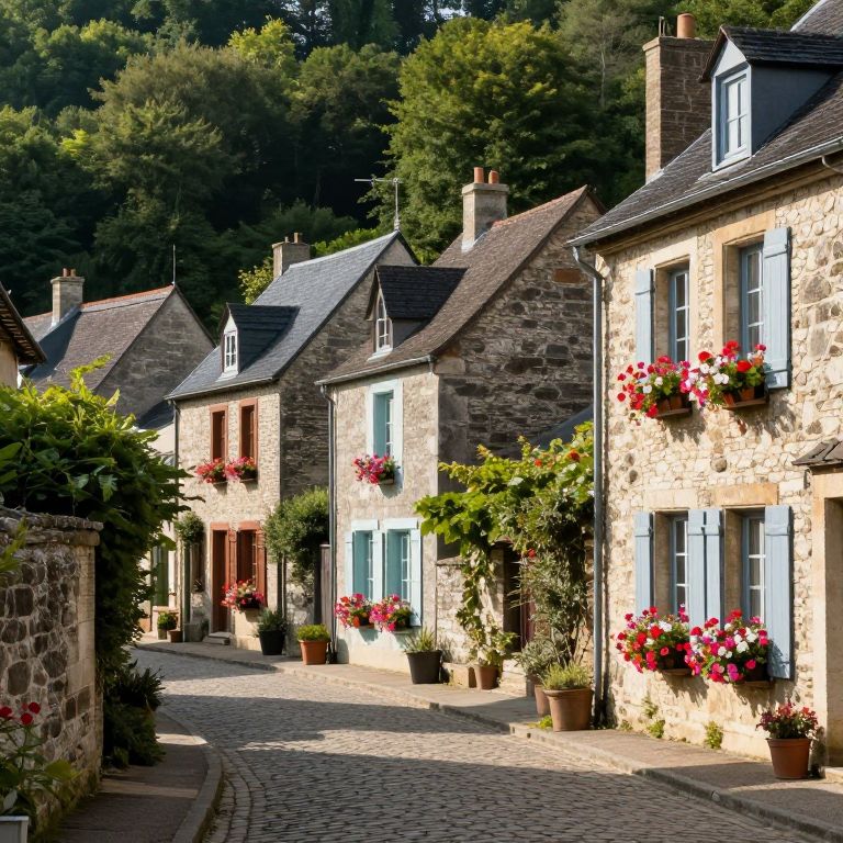 Photograph of a charming, sunlit cobblestone street lined with rustic stone cottages. The cottages have slate roofs, light blue wooden shutters, and colorful flower boxes filled with vibrant red and pink blooms. Potted plants and small bushes adorn the doorsteps and windowsills. The buildings are arranged in a row, receding into a lush, green forest in the background. The sunlight casts soft shadows, enhancing the texture of the stone walls and the cobblestones. The overall scene evokes a peaceful, picturesque countryside village.