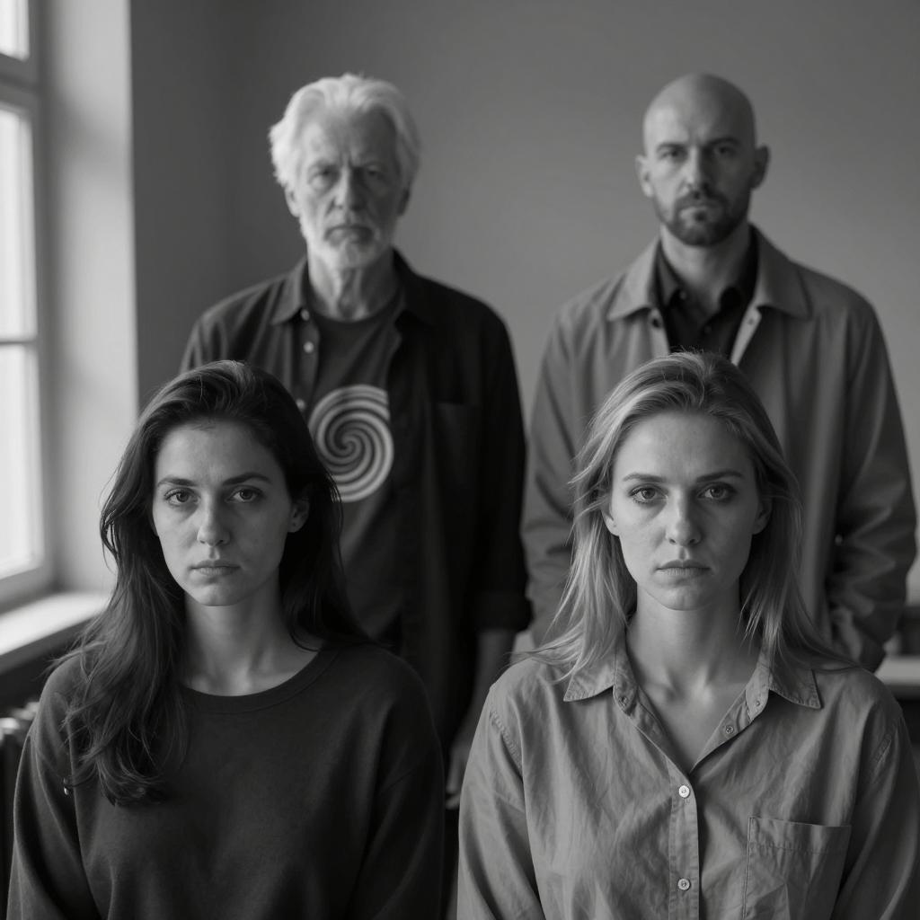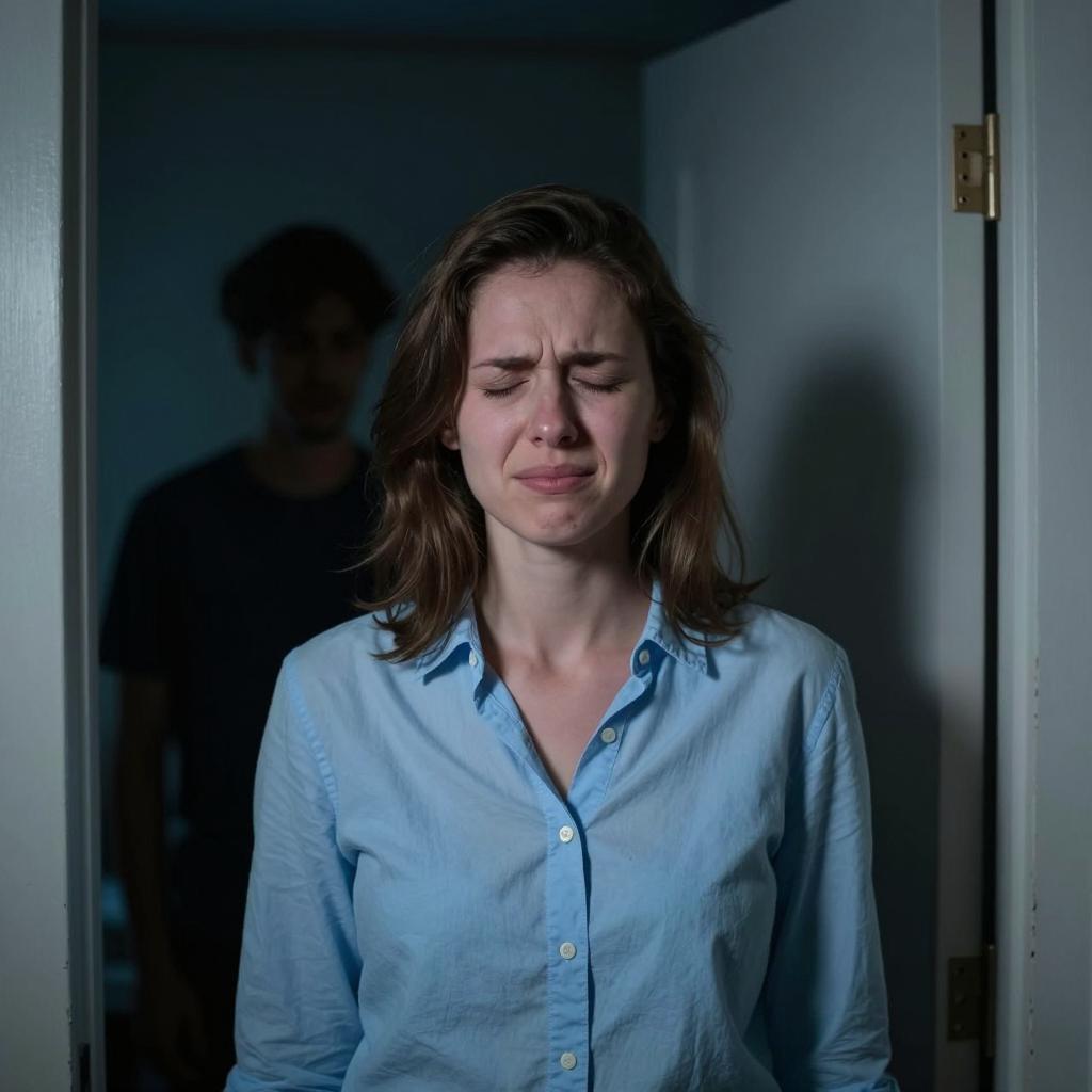Photograph of a woman with wavy blonde hair, light blue shirt, and visible teeth clenched in fear. A pale, masked figure with empty eye sockets and a beard is partially visible in the dark background. Two people. Dark setting.