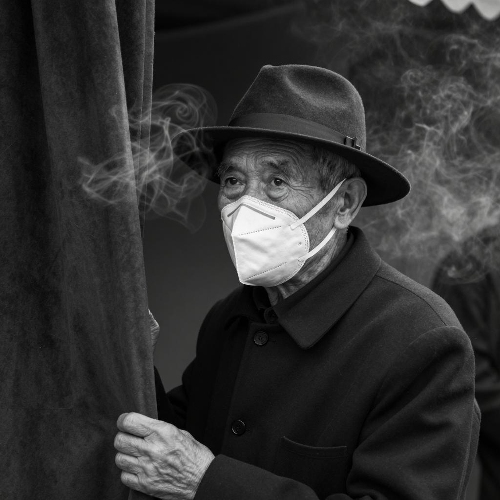 Old man with dark, wrinkled face, closed eyes, and grimacing mouth. Wearing tattered, black, flat-brimmed hat with frayed edges. Dark green coat. Background is blurry and dark. Smoke or mist around his head. Close-up shot.