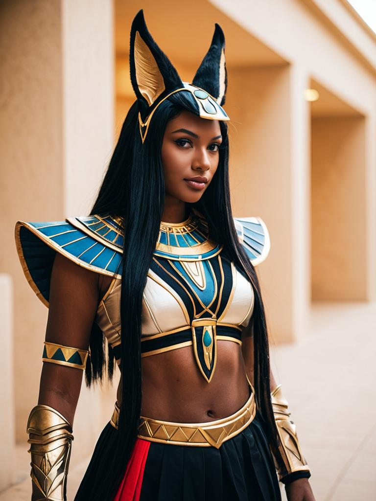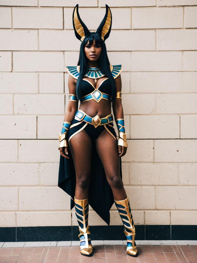 Photo-realistic cosplay photo of person in anubis (mythology) costume. 1girl, dark-skinned female, jackal ears, black hair, long hair, navellifestyle stock photo, shallow depth of field, lifestyle stock photography, shallow depth of field, natural lighting, warm tones, soft background blur, candid moments, vibrant colors, realistic textures, modern casual clothing. full body shot