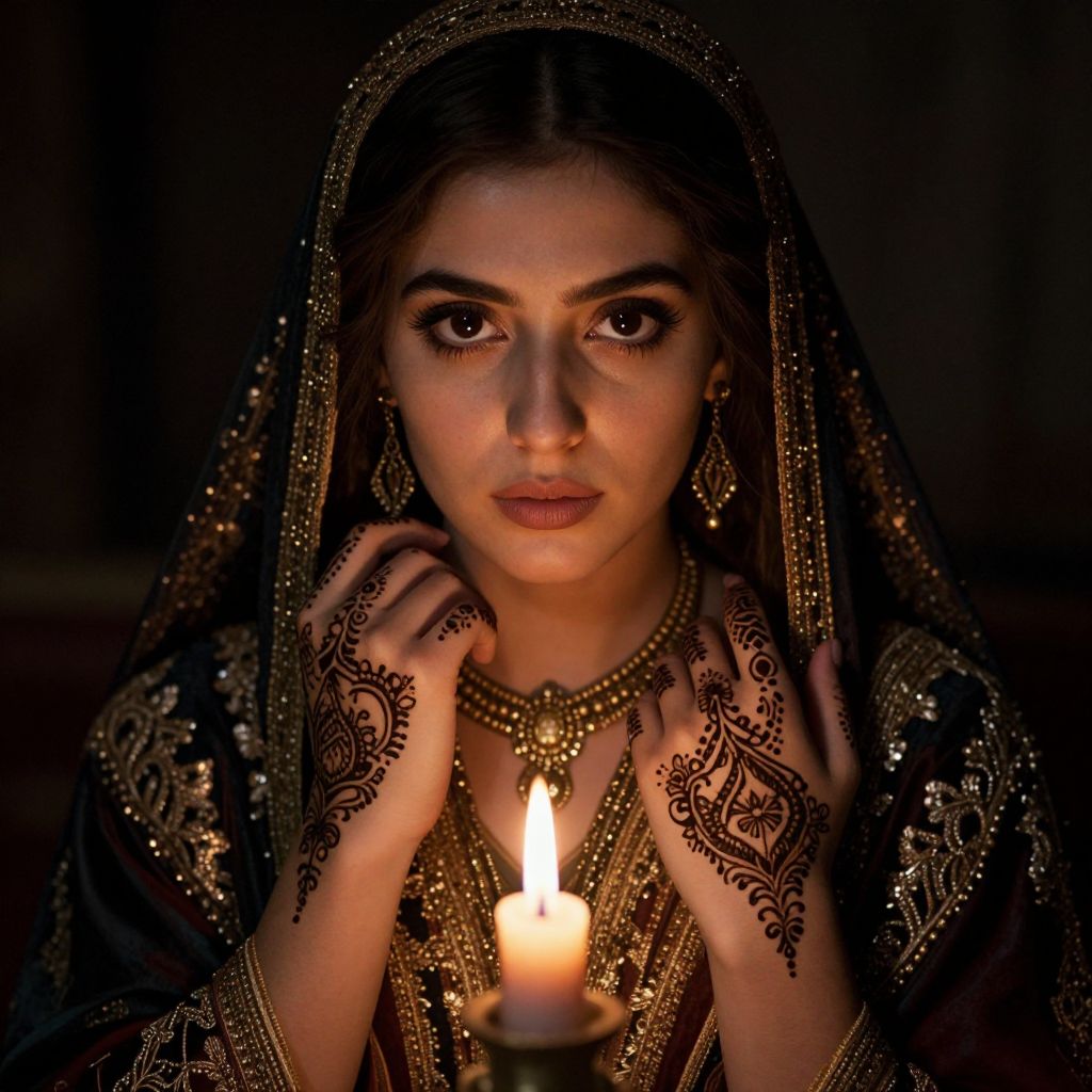 Create a photorealistic image in the style of Renaissance chiaroscuro, capturing the intense beauty of a Middle Eastern Slavic woman with a captivating gaze. Focus on her striking dark eyes and full lips, enhancing the portrait with a sense of mysterious allure. Illuminate the scene with soft candlelight, accentuating her porcelain skin and revealing intricate henna patterns on her hands. From a bird's-eye view, capture the rich textures of her embroidered clothing and ornate jewelry, harmonizing with the subtle contours of her face. Evoke a sense of intrigue and serenity within this ultrarealistic portrait, drawing viewers into her mysterious and enchanting world.