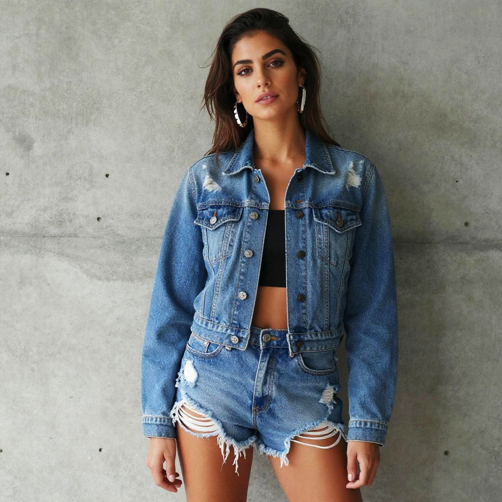 A confident young woman poses against a textured concrete wall, wearing a casual denim jacket and matching distressed denim shorts. Her relaxed yet stylish outfit is complemented by statement earrings and a subtle makeup look, showcasing contemporary street fashion.