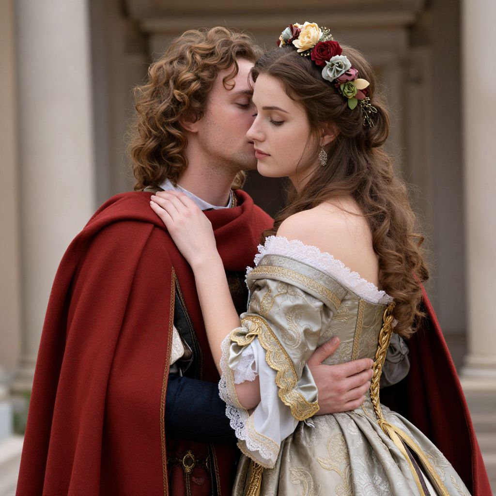 Photograph of a romantic scene featuring a young couple in Renaissance-style attire. The man, with curly brown hair and fair skin, wears a red velvet cape and black shirt, gently kissing the forehead of the woman. She has long, wavy brown hair adorned with a floral crown, and wears an off-the-shoulder, pale gold dress with gold trim and white lace. Her fair skin contrasts with the rich red of his cape. They stand close, with his hand on her waist, in front of a blurred, classical building with columns. The image exudes a sense of intimate, historical romance.