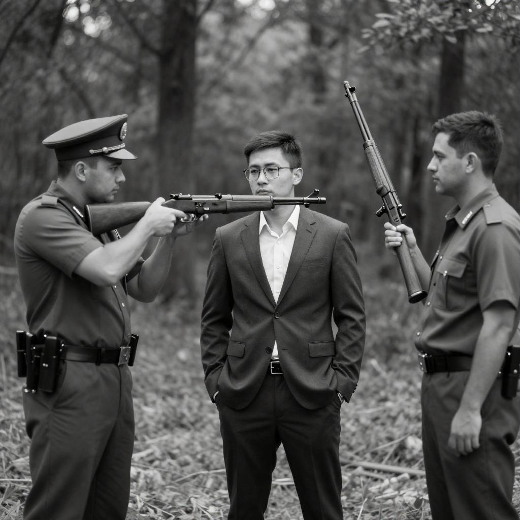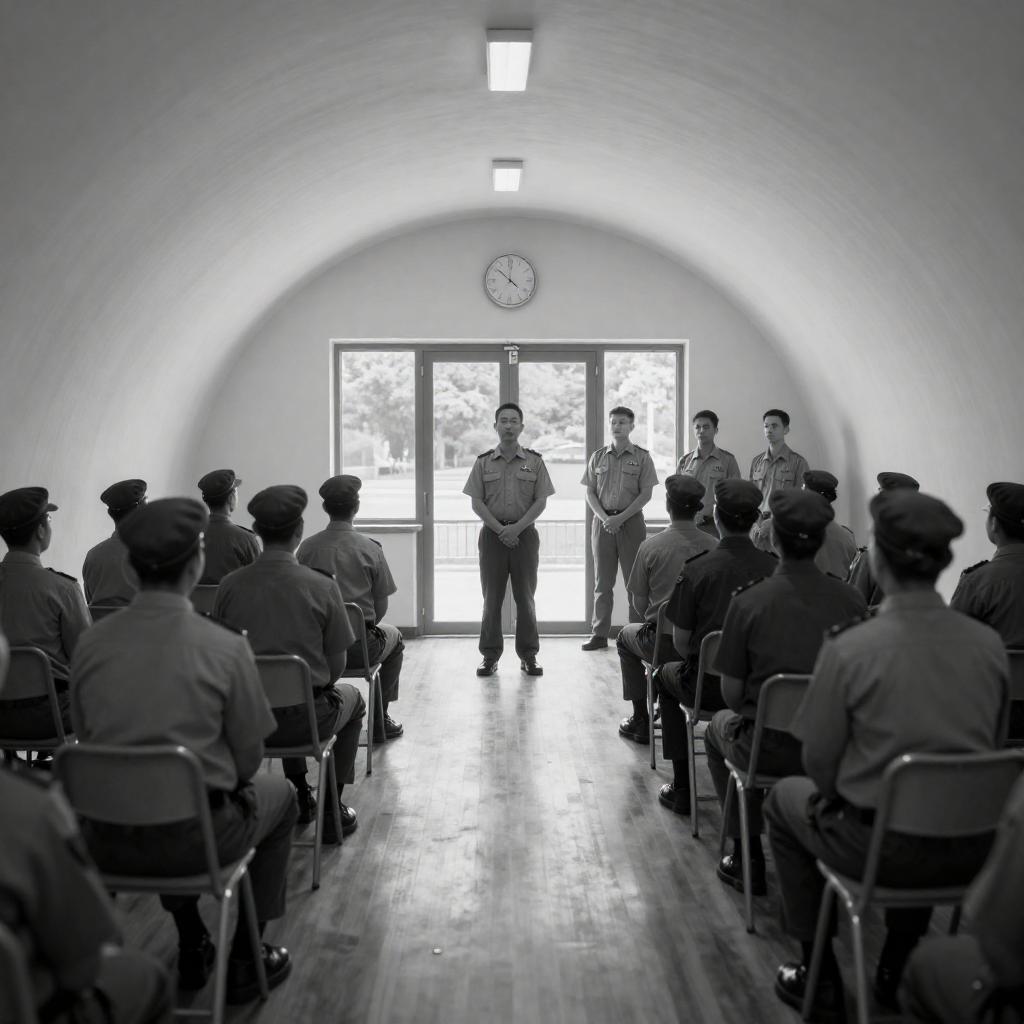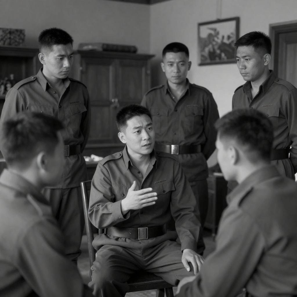 Black-and-white photograph of three men in military uniforms. Two men in dark coats with badges and caps stand outside a wooden cage, facing a third man in a lighter coat and cap inside the cage. The man inside the cage smiles, holding the bars. The background shows a wooden wall.