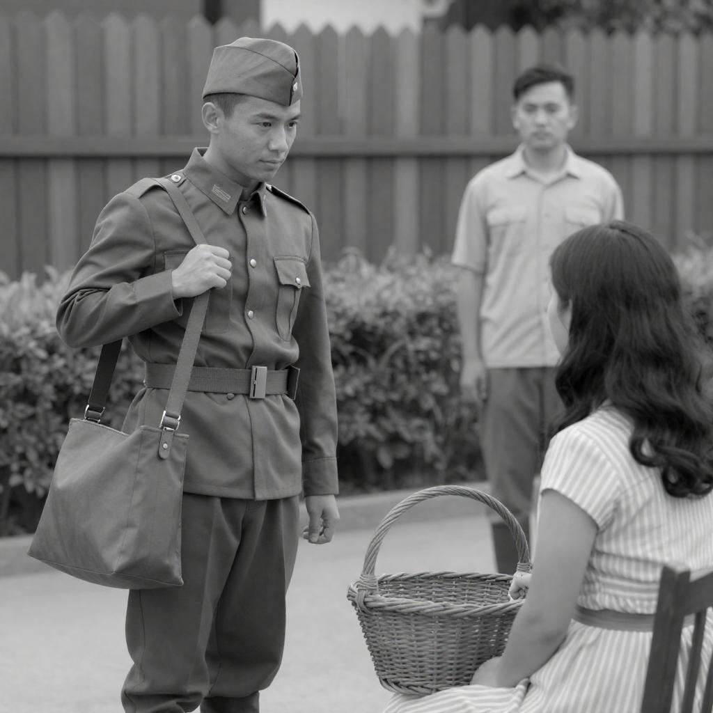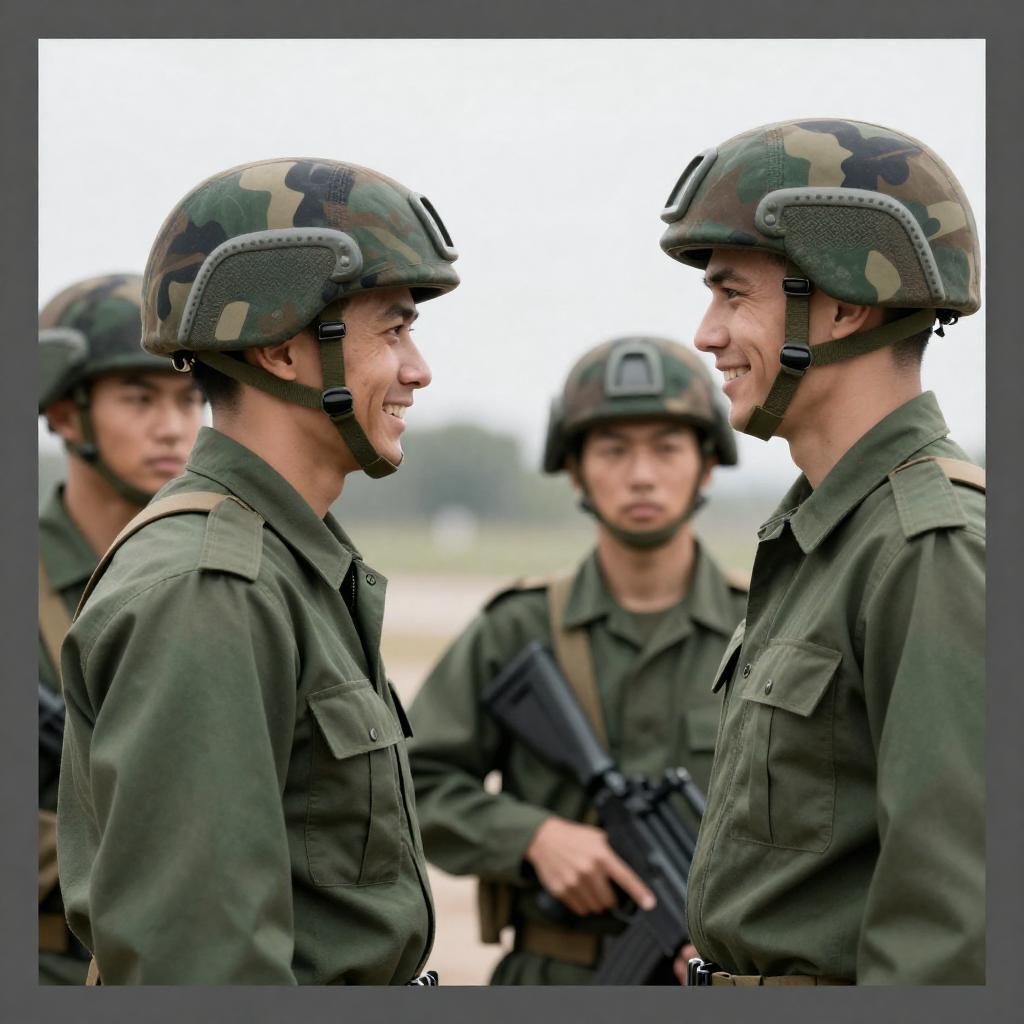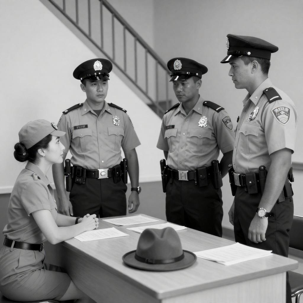 Black-and-white photograph of three men in military uniforms. Two men in dark coats with badges and caps stand outside a wooden cage, facing a third man in a lighter coat and cap inside the cage. The man inside the cage smiles, holding the bars. The background shows a wooden wall.