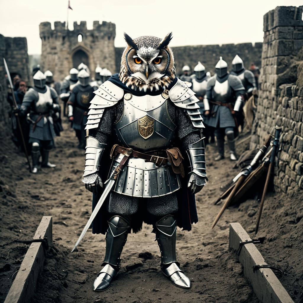 A surreal image of an owl wearing detailed medieval knight armor standing confidently in trenches during a daytime battle. The armored owl holds a sword with other knights blurred in the background against the backdrop of a stone fortress. The scene combines fantasy elements with historical medieval warfare setting.