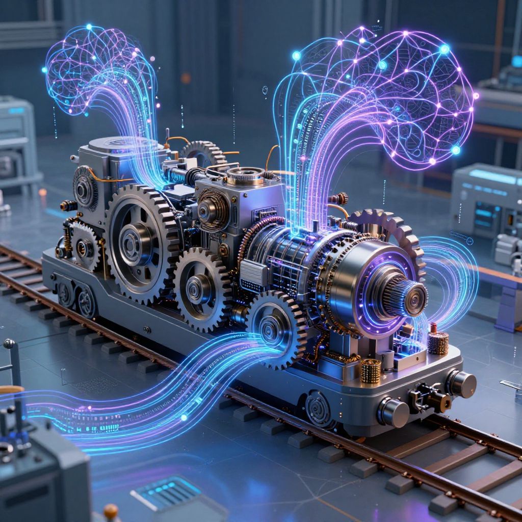 Stable diffusion train model depicted as a large machine learning engine on rails, massive gears and digital data streams intertwined, surrounded by abstract neural network patterns, glowing blue and purple hues, set in a high-tech laboratory environment, intricate and dynamic.