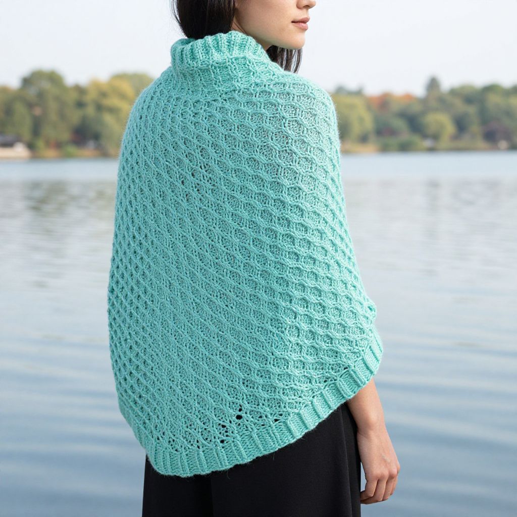 Woman standing by a serene lake, donning a delicate aqua green shawl with a honeycomb knit texture, showcasing the Glykos Shawl Knitting Pattern.
