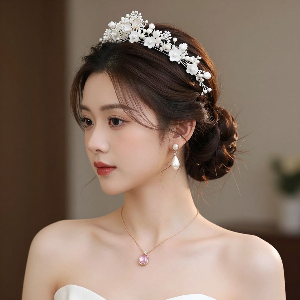 Photograph of an Asian woman with fair skin and dark hair styled in an elegant updo, adorned with a delicate white floral tiara. She wears a strapless white dress and a gold necklace with a pink gemstone pendant. Her makeup is subtle, with red lipstick, and she has white teardrop earrings. The background is blurred, featuring a brown wall and a vase with flowers. The image has a soft, romantic feel, emphasizing her serene expression and refined beauty.