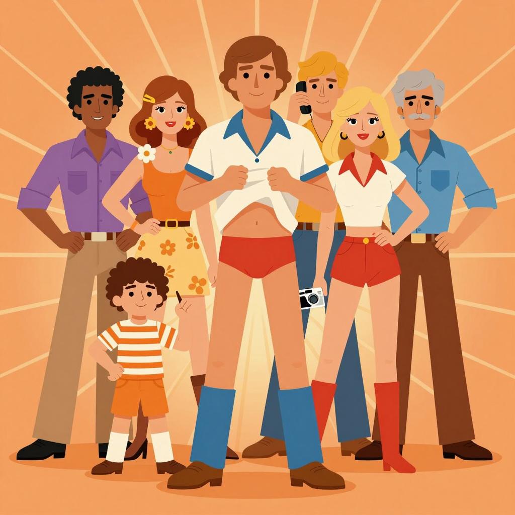 Illustration of eight people in retro style. Central figure, man with brown hair, shirt lifted to reveal red underwear, stands in front. Surrounding him, people in 1970s attire: black man in purple shirt, blonde woman with flower, blonde man with phone, blonde woman in red shorts, grey-haired man in blue shirt, blonde woman with camera, and child in striped shirt. Orange background with yellow radial lines.