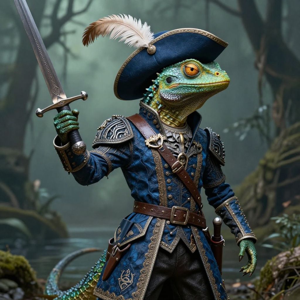 Digital artwork of a green-scaled lizard in 18th-century pirate attire, holding a sword with a feathered hat, in a misty forest