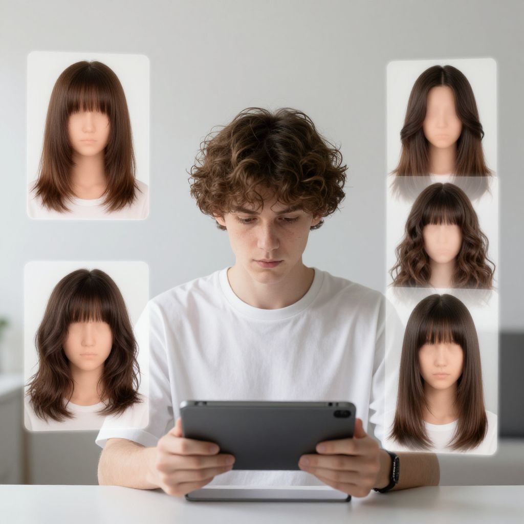 Virtual hairstyle try on scene, young man using a tablet to test various hairstyles in augmented reality, sharp focus on realistic hair details, soft lighting, minimalistic futuristic room, holographic hair options displayed vividly around him