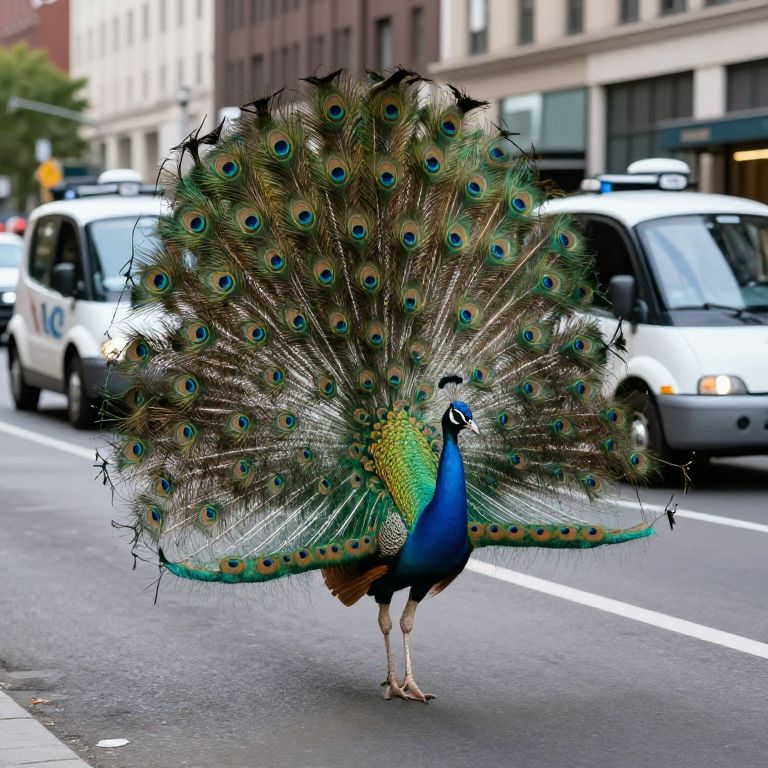 In a surreal dance of nature and urbanity, a peacock stands resplendent amidst the chaos of city streets, its kaleidoscopic tail a vibrant testament to the enduring beauty of life, while the precise movements of autonomous vehicles echo the relentless march of progress, creating a poignant juxtaposition of freedom and order.