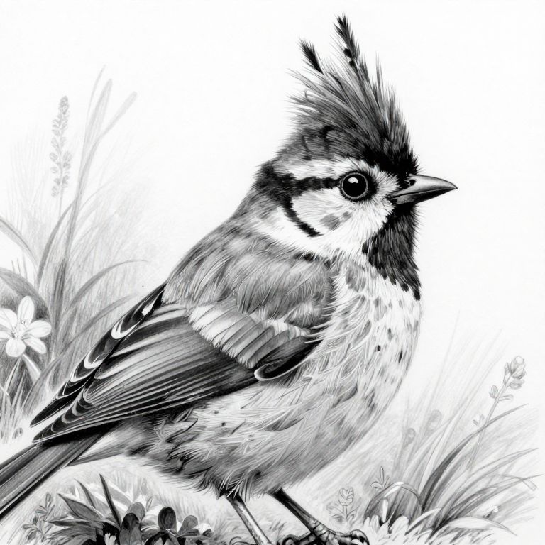 A detailed black-and-white pencil drawing of a whimsical bird, showcasing intricate feather textures and a striking crest, rendered in a nature-inspired illustration style.