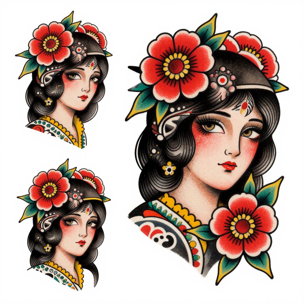 Detailed old-school tattoo artwork featuring a woman's face adorned with vibrant red flowers and intricate floral patterns, showcased in three distinct angles highlighting its vivid colors and traditional style.