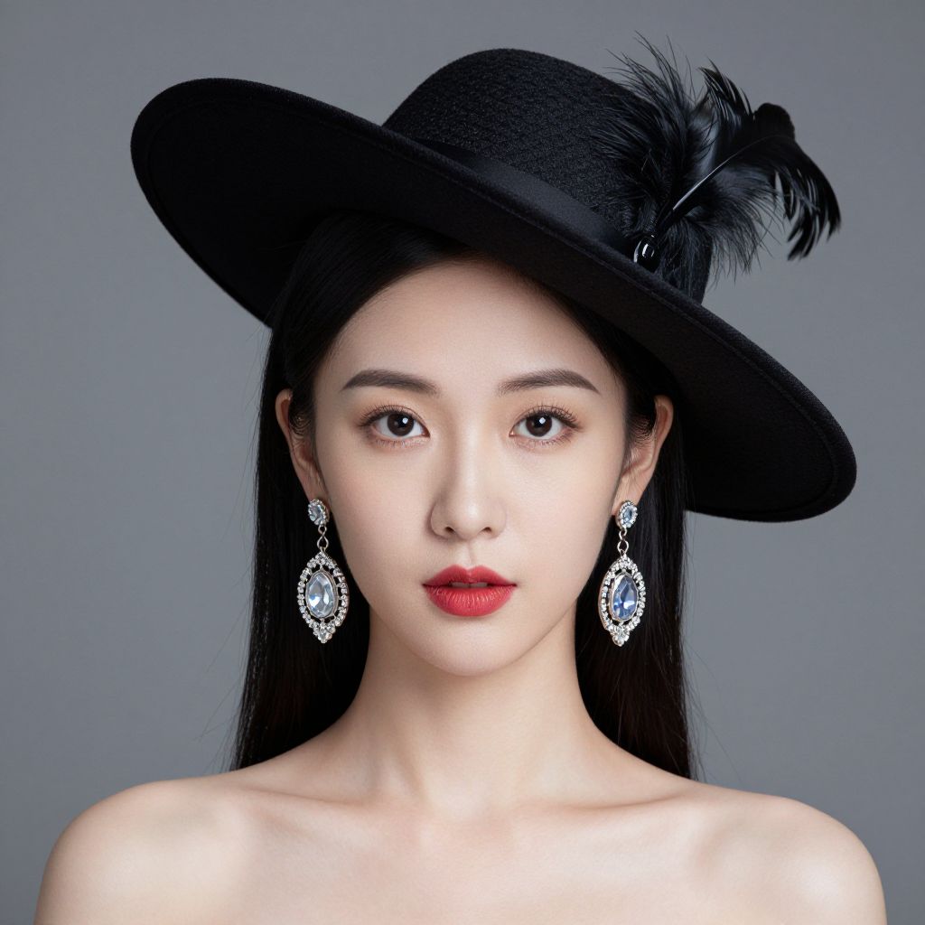 Photograph of an East Asian woman with fair skin and long black hair, wearing a black wide-brimmed hat adorned with a black feather. She has red lipstick, subtle eye makeup, and is wearing large, dangling diamond-shaped earrings. Her bare shoulders are visible, suggesting she is not wearing a top. The background is a solid gray, keeping the focus on her elegant, vintage-inspired look. The image has a soft, studio-lit quality, highlighting her features and the textures of her hat and earrings.