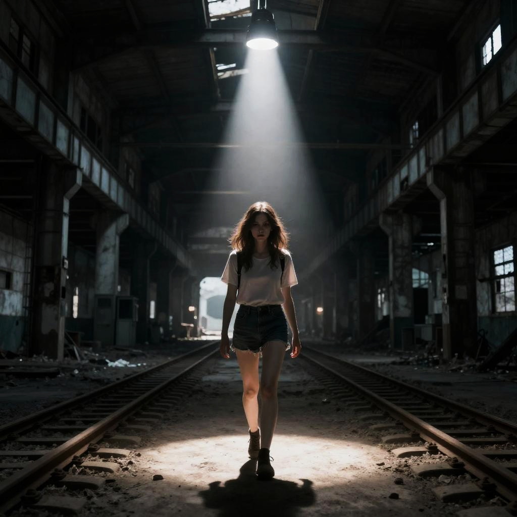 A young woman walks confidently along railroad tracks inside an abandoned, dark, and decaying factory or train station. A bright spotlight from above illuminates her, highlighting her casual outfit of a light-colored t-shirt, black shorts, and black boots amid the eerie industrial ruins. The setting is atmospheric, with broken windows and dilapidated walls contributing to a haunting, horror-inspired mood.