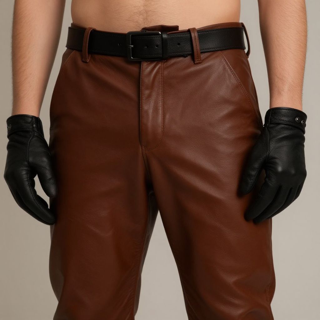 Photograph of a light-skinned, shirtless man from the waist down, wearing dark brown leather pants with a black leather belt and black leather gloves. The pants fit snugly, highlighting his average build. The gloves are slightly shiny, contrasting with the matte texture of the leather pants. The background is a plain, light gray, drawing focus to the man's attire. The image is sharp with clear details, emphasizing the textures and colors of the leather. The man's arms are slightly relaxed at his sides.