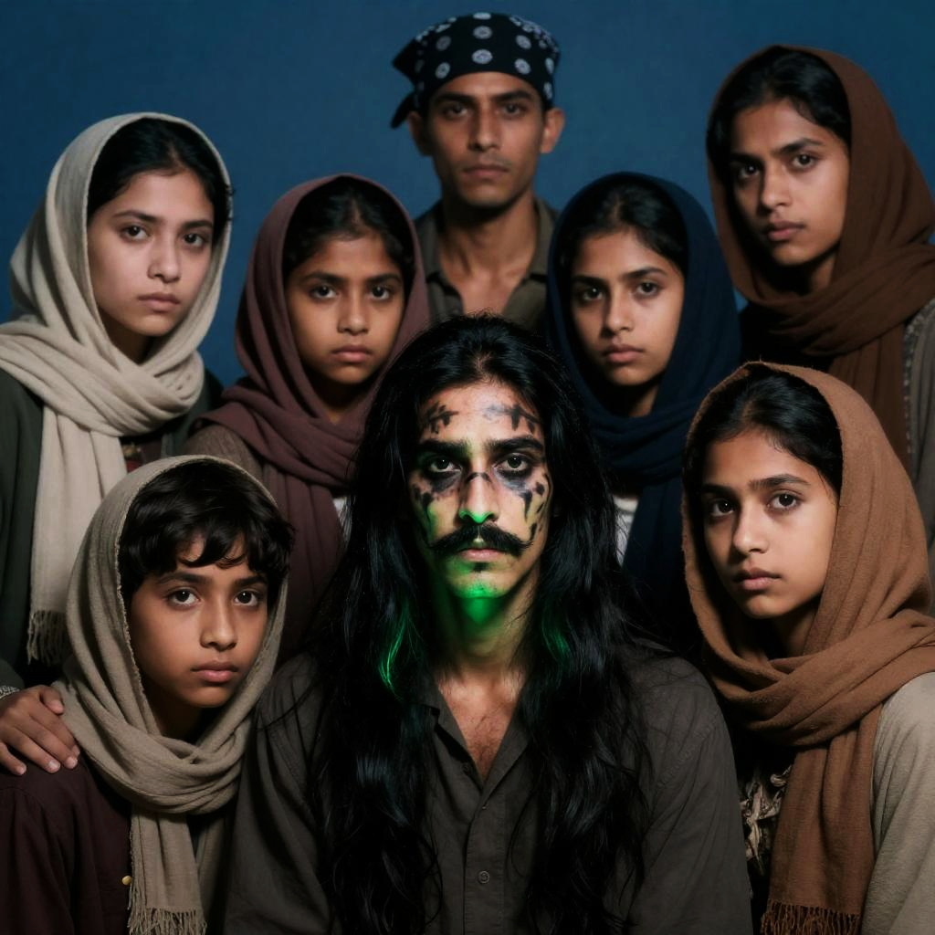 Photograph of a group of six people with intense facial expressions. Central figure has long black hair, mustache, green glowing aura, and black face markings. Surrounding individuals wear varied headscarves and clothing, blue and brown backgrounds. Two children on left, two adults on right, one person with a bandana in the back. All focused on central figure.