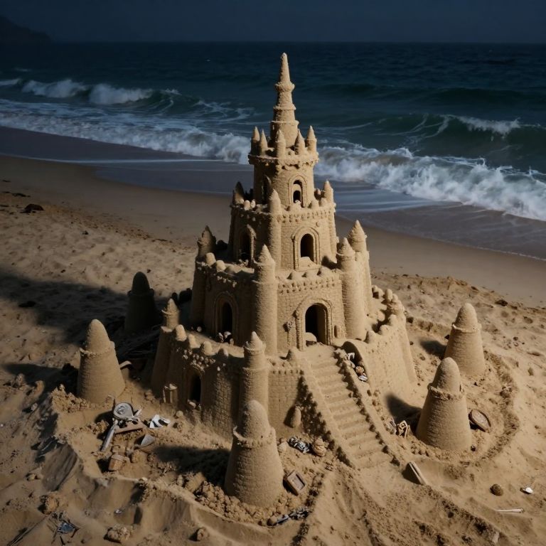 Envision an evocative and melancholic scene reminiscent of Tim Burton's unique vision, portraying a majestic sandcastle perched atop the shoreline as it succumbs to the encroaching darkness. The once-magnificent edifice is now being consumed by the relentless waves, revealing intricate passageways and forsaken chambers filled with long-forgotten artifacts. From an aerial viewpoint, capture this poignant tableau that embodies the fleeting nature of grandeur and invites contemplation on the memories and tales left behind in the shifting sands.