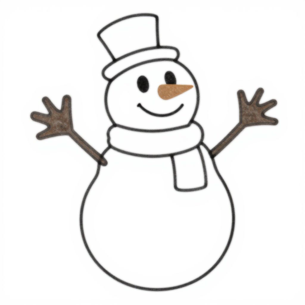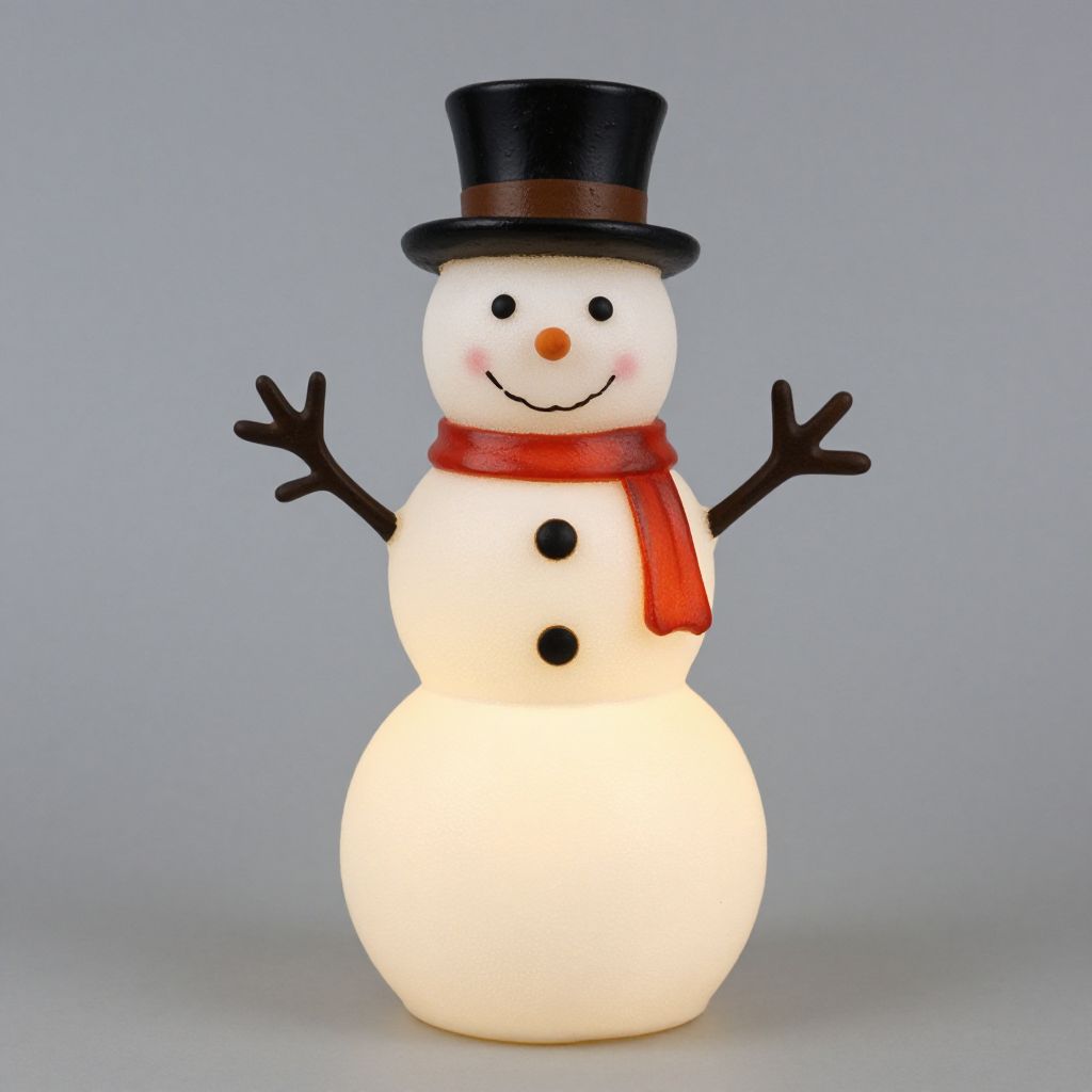 Photograph of a classic snowman figurine with a white, round body, black coal buttons, black stick arms, and a black top hat. The snowman has a smiling black dot mouth, black dot eyes, and an orange carrot nose. It wears a bright red scarf around its neck. The background is a plain, light gray, and the snowman is centered in the image. The figurine has a glowing effect, suggesting it may be illuminated from within. The overall style is simple and festive, evoking a cheerful winter theme.