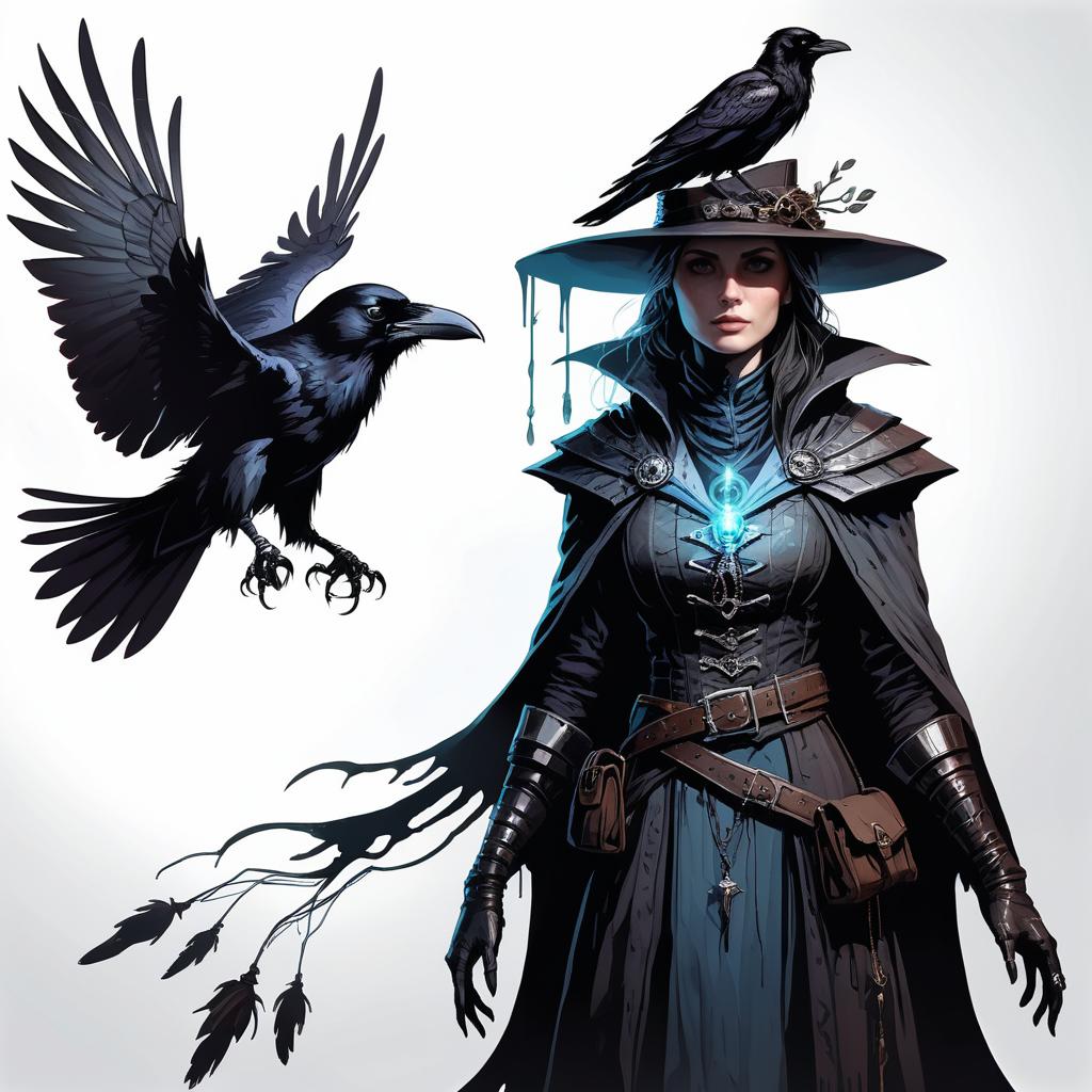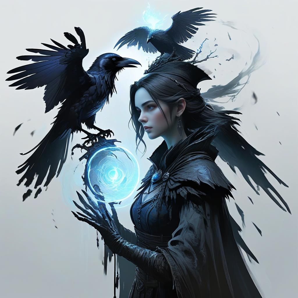 A dark-clad witch wearing a wide-brimmed hat adorned with blue gems, accompanied by two large black ravens. She holds a glowing mystical orb emitting blue light and sparks in one hand, while holding a staff with a similar blue gem in the other. Her outfit features intricate details with feathers on the shoulders, flowing sleeves, and layered fabric, creating an enchanting and powerful magical aura.