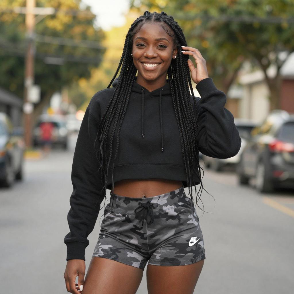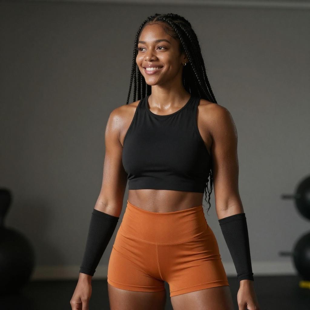 Photograph of a fit, young Black woman with long black hair in a high ponytail, wearing a black sports bra and high-waisted black shorts, standing against a chain-link fence. She has a toned, muscular physique, medium brown skin, and white sneakers. Her confident stance and direct gaze convey strength and determination.