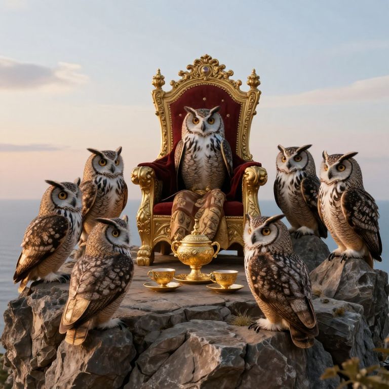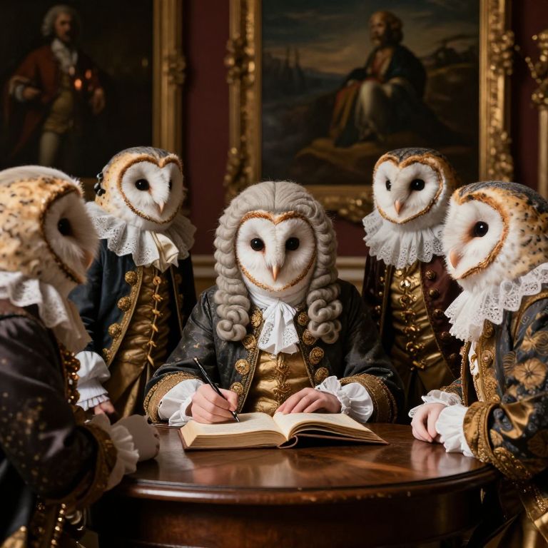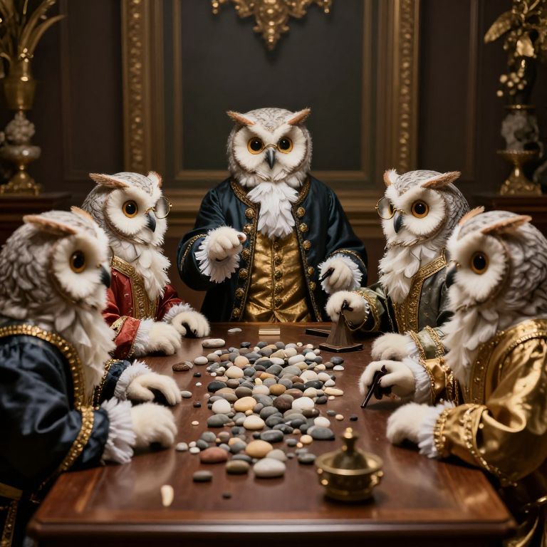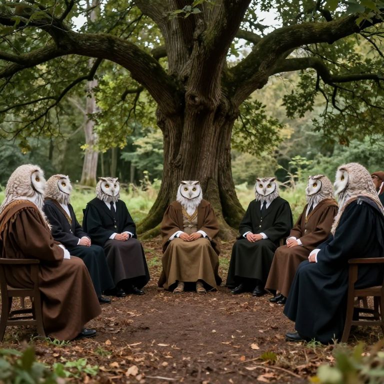 In a serene woodland court, a parliament of owls in formal attire convenes beneath ancient trees, their solemn expressions and deliberate actions symbolizing the weight of wisdom and the timeless pursuit of justice, as the earthy scent of sap intertwines with the hushed whispers of nature.