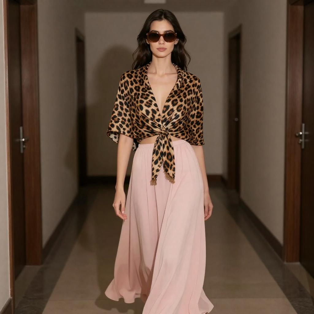 Photograph of a slender woman with fair skin and dark hair, wearing large brown sunglasses, a leopard-print shawl over a pink, flowing skirt. She stands in a dimly lit hallway with wooden doors, casting a shadow on the floor.