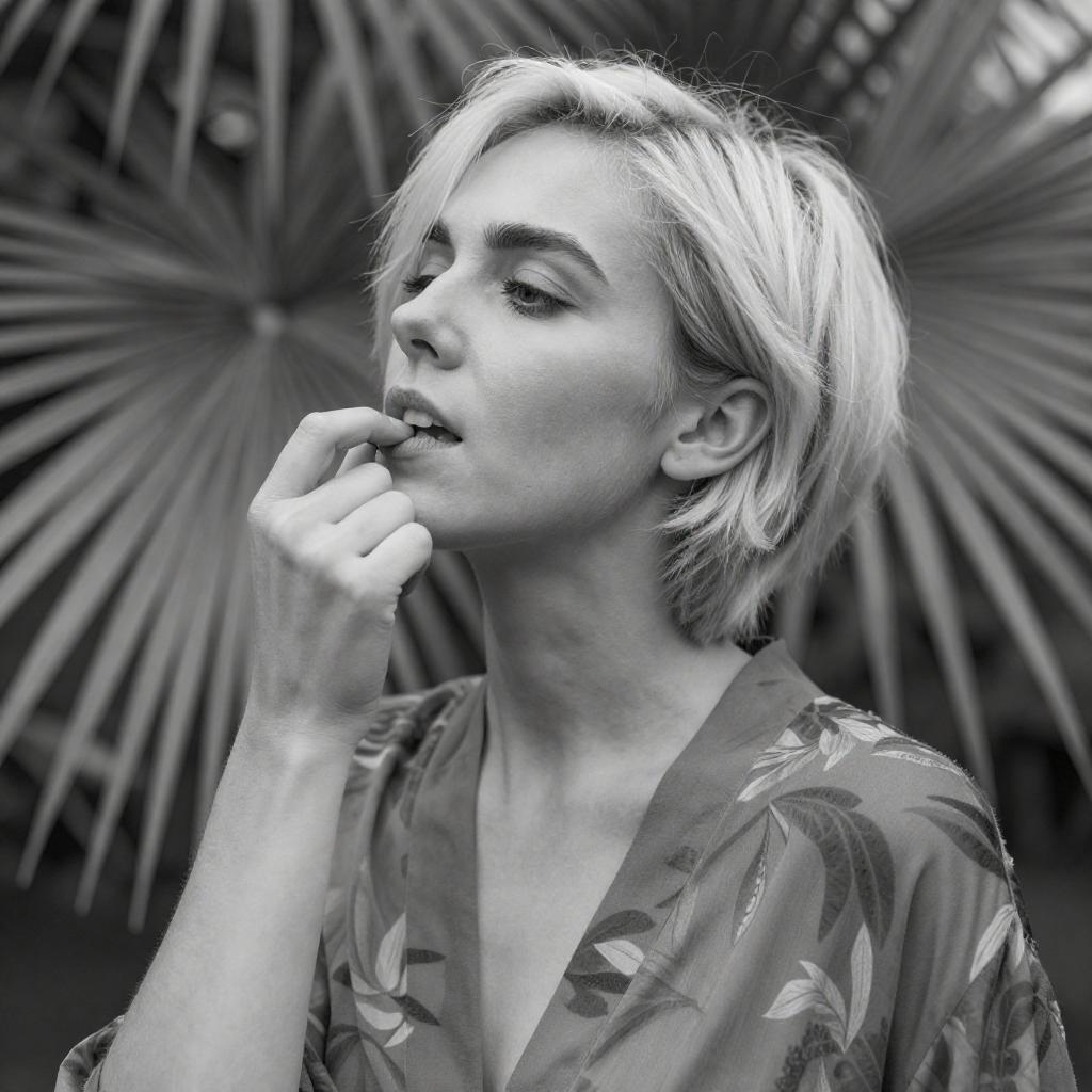 Black-and-white photograph of a woman with short, platinum blonde hair. She is wearing a sheer, patterned robe, looking up and biting her finger. Her eyes are half-closed, and her expression is slightly pensive. Palm fronds are in the background, partially out of focus. She is positioned in profile, with her head tilted back slightly.