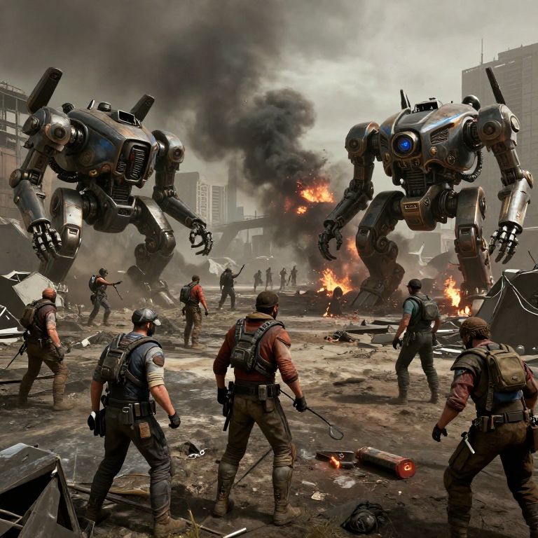 Digital art: Robot mechs in urban battle, soldiers with gear and helmets, smoke, fire, and debris; intense, chaotic scene.