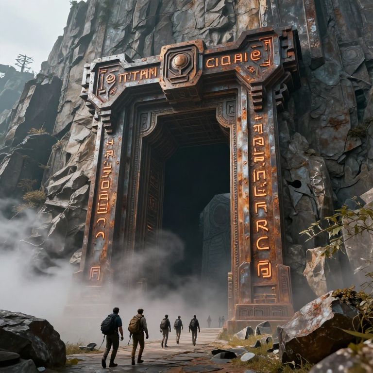 Photorealistic CGI image of a massive, ornate stone archway set into a towering, rugged rock cliff. The archway, adorned with glowing orange runes, stands tall with intricate carvings and metallic accents. Mist swirls at the base, partially obscuring the entrance. Five silhouetted figures, dressed in dark, adventure-style clothing, stand at the archway's entrance, looking inside. The rocky cliff is textured with sharp edges and sparse vegetation. The overall scene evokes a mysterious, ancient, and adventurous atmosphere.