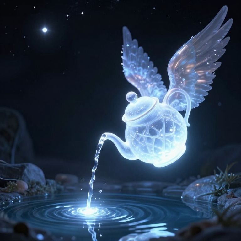 A luminous teapot adorned with ethereal wings, reminiscent of a weeping angel, pours radiant liquid light into moonlit pools on a starry night, evoking a surreal, otherworldly atmosphere in a high-definition digital rendering.