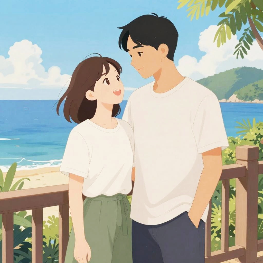 Anime-style digital drawing of a smiling couple standing on a wooden beachside balcony, wearing white shirts and green pants, with a blue ocean and tropical foliage