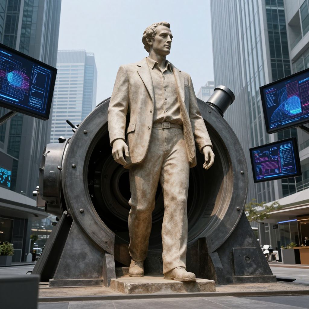A statue of a man emerging from a machine, surrounded by modern architecture and digital screens, symbolizing the intersection of art and technology.
