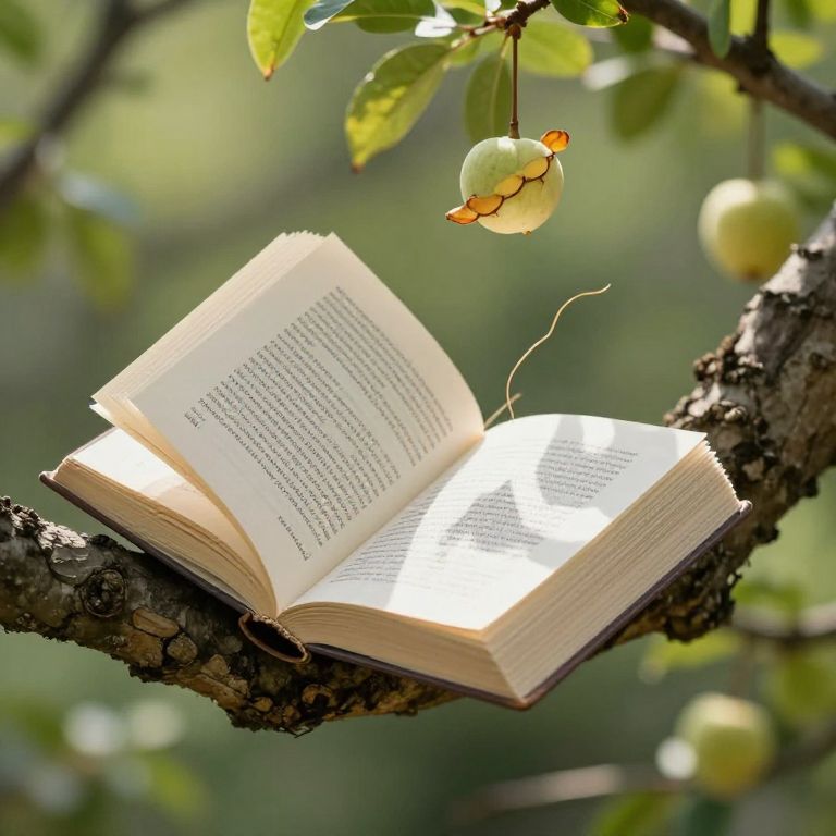 Books sprout from trees like fruit, their pages fluttering in the wind even when unread, whispering secrets that change each time they are closed.