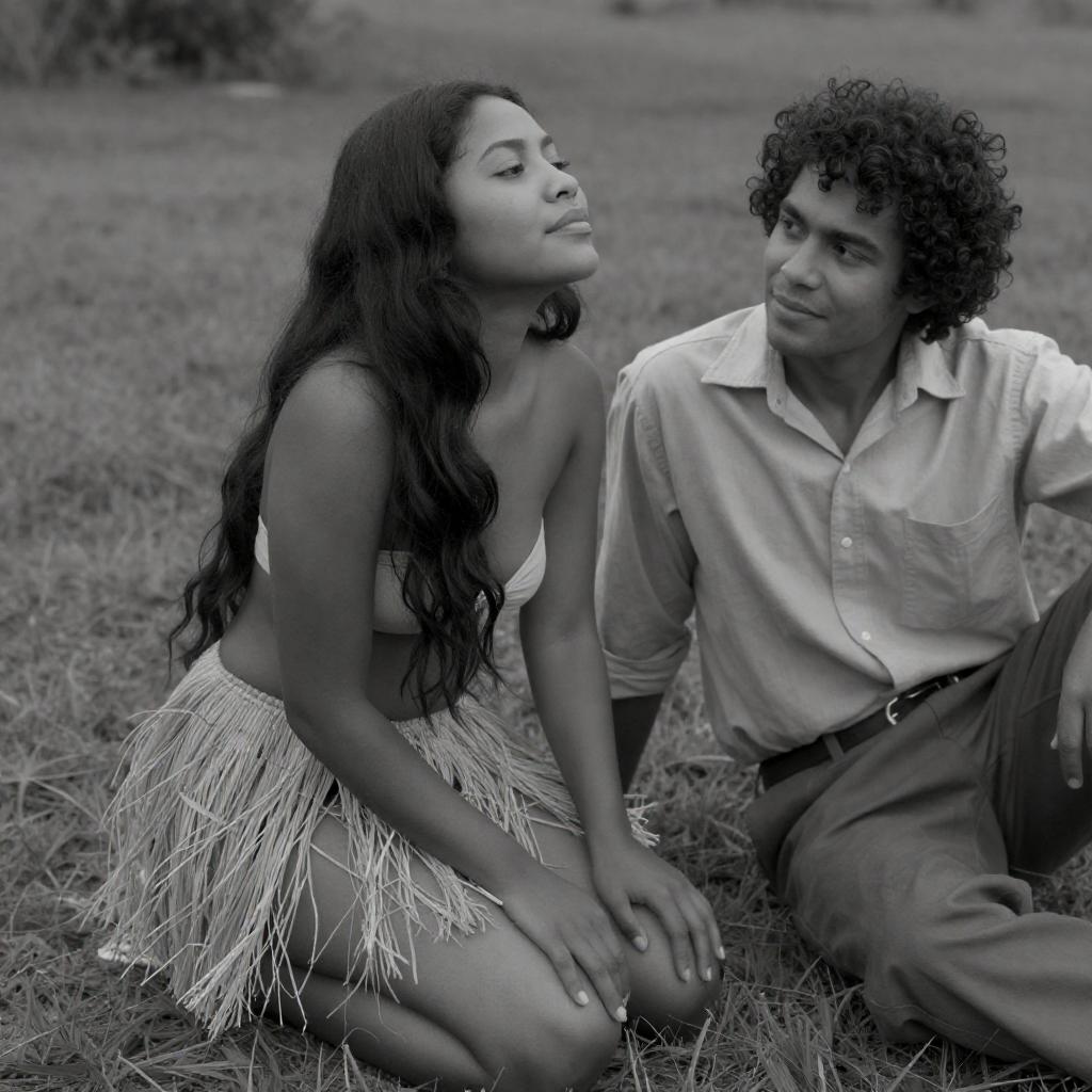 Black-and-white photograph of a topless woman with long dark hair, kneeling and looking up, wearing a grass skirt. A man with curly hair, wearing a buttoned shirt and belt, sits beside her on the ground. Background shows grassy terrain. The woman's expression is serene, while the man looks at her with a slight smile.