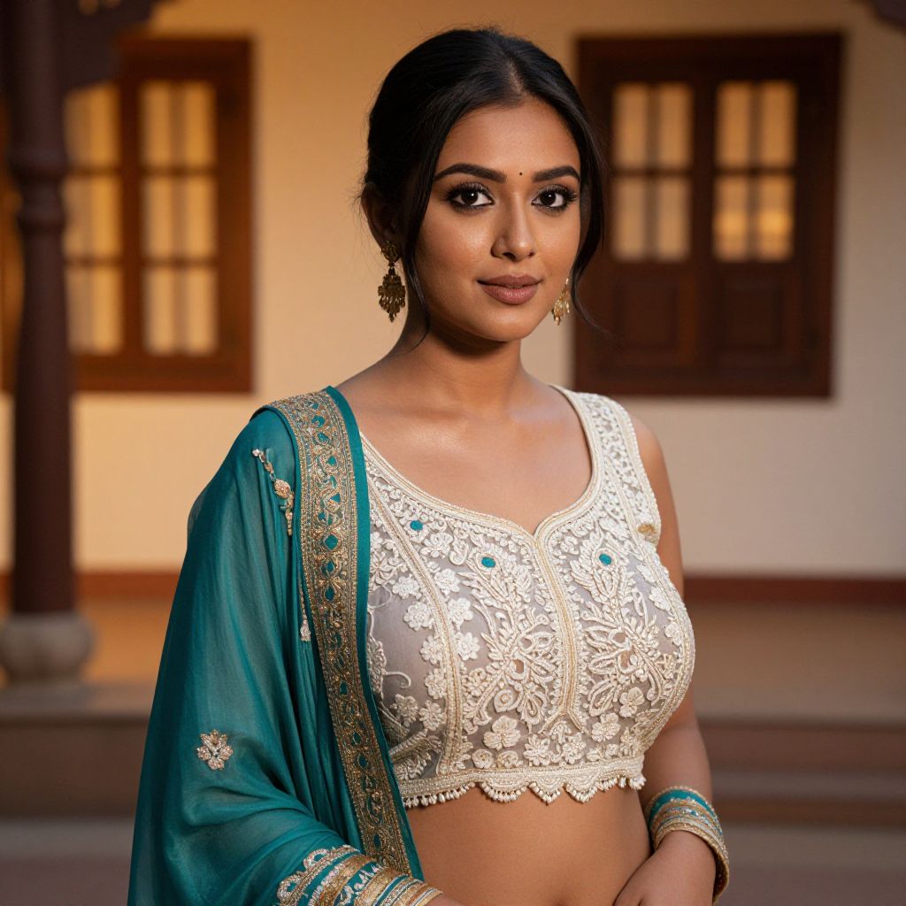 A beautifully crafted chikankari suit dupatta costume worn by a young Indian woman with warm brown skin, expressive dark eyes, and straight black hair tied in a neat bun, standing in a traditional haveli courtyard during a cultural evening festival with soft golden light filtering through old wooden windows.. The woman has big tits and cute face